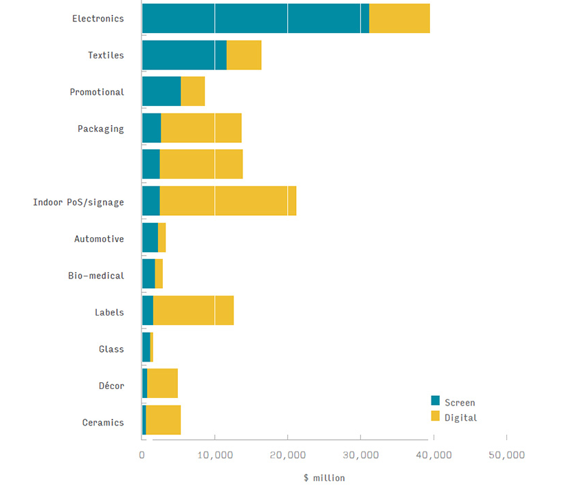 根据史密瑟斯公司最新研究,到 2025 年,丝网印刷和数码印刷在工业印刷应用领域的总价值将达到 817 亿美元,占全球市场价值的 58.8% 和销量的 75.1%。
