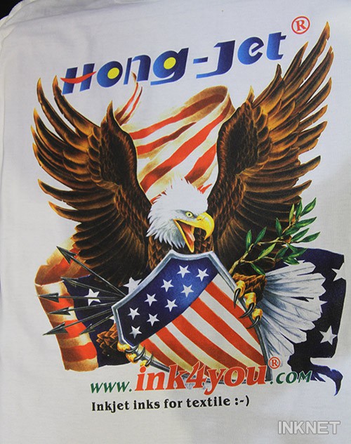 2015上海广告展,鸿盛数码还现场展示了应用“捷特丝®”三代纺织涂料墨水打印T恤方案。“捷特丝®”三代纺织涂料墨水是一款基于纳米颜料、完全符合喷墨印染机械生产方式的专业的数码印花墨水。此款墨水分为彩色和黑色两种,白色墨水属国内首创,打印深色衣物时结合白色墨水打底使用,可使图案突出、对比清晰,色彩明艳,真正达到图案对服装的点缀作用,避免了深色衣物打印图案的模糊现象。展会现场,“捷特丝®”三代纺织涂料墨水配合HJ-8495平板数码印花机直喷纯棉T恤、裁片等织物印花,色彩靓丽、清晰自然的打印效果吸引了众多追求高品质、个性化的参展观众。
