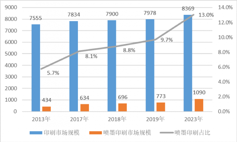 到2023年,喷墨印刷市场规模预计将达到1090亿美元,比2013年增加656亿美元,增长151.15%,在印刷市场总规模当中的比重将达到13%。