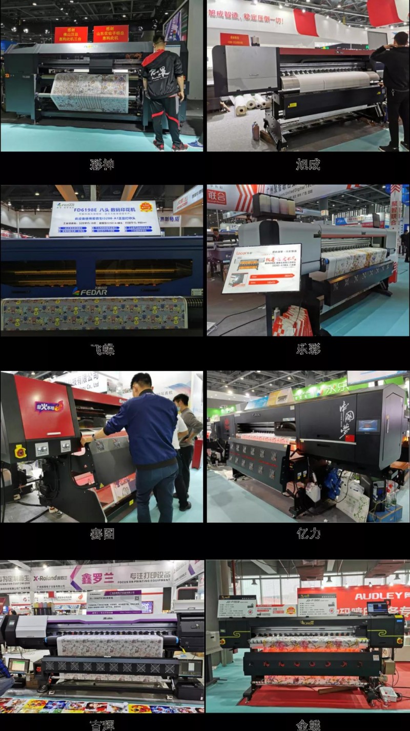 纺织服装印花行业的产品也迫不及待亮相在牛年广告展第一展。我们看到,去年热度极高的烫画写真机、还有热转印机新品都采用了爱普生打印头。烫画写真机多使用I3200-A1打印头,一般配置在2头。热转印机新品不少,彩神、乐彩、奥德利、金谷田、赛图、旭成、翔彩、鑫罗兰、飞碟等品牌都有新机推出。分别采用了S3200-A1和I3200-A1打印头。而且,像赛图、旭成、翔彩等品牌印花机都搭载了15个I3200-A1头,极大的提升了打印速度。不少品牌都引进了多头装置,现场最高速度达到了600㎡/h称奇的速度。