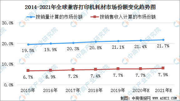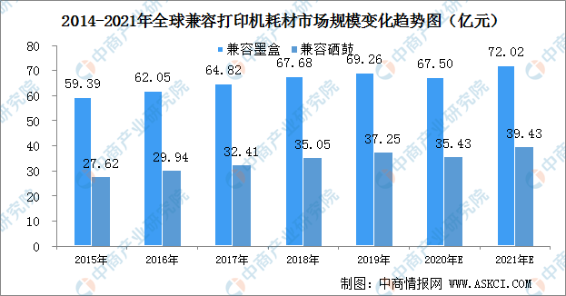 预计到2021年,全球兼容打印机耗材市场中,兼容墨盒市场规模将超70亿元,兼容硒鼓市场规模达39.43亿元。
