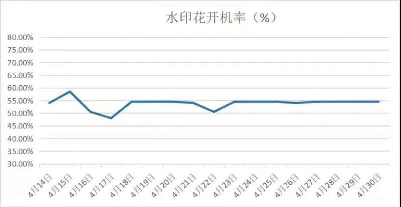 通过对多家水印染厂的持续跟踪,4月下半月水印染厂的开工率徘徊在55%左右,整体变化非常微弱。一方面,它可以解释说,将近一半的印刷机在水印染工厂关闭,另一方面,它也表明,水的订货批量印刷在半个月是相对稳定的,并一直在低水平。而且不仅仅是4月份的水印订单,3月份样品水印刷厂的平均运行率不到40%。