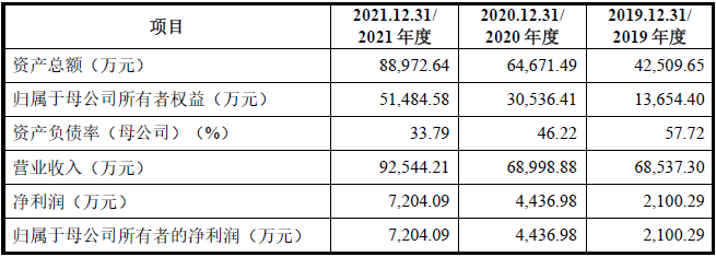 据招股书显示,2019-2021年,报告期内,世纪开元实现营业收入分别为68,537.30万元、68,998.88万元和92,544.21万元,其中2021年主营业务收入较2020年增长33.87%。三年净利润分别为2100.29万元、4436.98万元和7204.09万元。