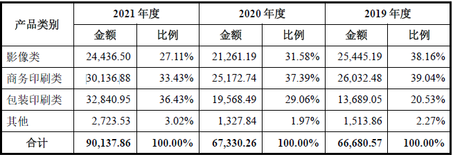 2021年,世纪开元来自影像、商务印刷及包装印刷类产品的营收分别为2.44亿元、3.01亿元、3.28亿元,占主营业务收入的27.11%、33.43%、36.43%。