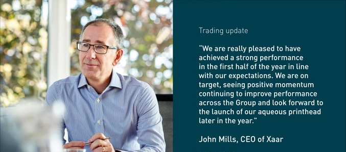 首席执行官约翰米尔斯评论说:“我们很高兴在上半年取得了符合我们预期的强劲业绩。我们正朝着目标前进,看到积极的势头继续改善整个集团的业绩。我们继续在战略和运营方面取得进展,并继续实现长期盈利增长。尽管宏观经济前景仍然不确定,但我们对未来充满信心和兴奋,并期待在今年晚些时候推出我们的水性打印头。”