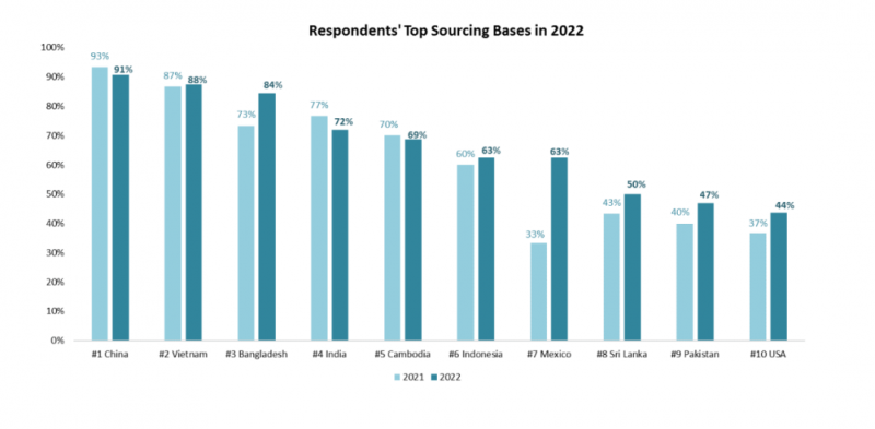 在采购多元化的同时,亚洲国家仍居于主要地位,在美国纺织服装企业最主要的10个采购国中,亚洲占8个,其中中国、越南、孟加拉国和印度位居前四,分别有91%、88%、84%和72%的受访企业在上述国家进行采购。前十中仅有的两个非亚洲国家为墨西哥和美国本土。