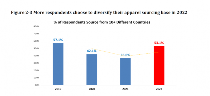 为适应不断变化的商业环境,应对船运延迟、供应链中断、采购来源过于集中等问题,越来越多的美国纺织服装企业关注采购多元化问题。调查显示,2022年美国纺织服装企业采购地包括全球48个国家和地区,高于2021年的43个。超过半数的受访企业2022年相比2021年更加多元化,其中53.1%的受访企业采购地超过10个国家和地区,高于2021年的36.6%和2020年的42.1%,这种趋势在员工人数少于1000人的企业中更加明显。
