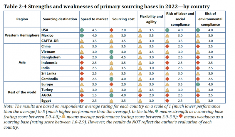 根据对受访企业的调查,在美国企业眼中,2022年各个采购地的优、劣势出现一些变化。受船运延迟和供应链中断影响,美国本土和墨西哥凭借地理优势,在市场响应速度方面的优势更加突出。而越南、孟加拉国、柬埔寨等东南亚和南亚国家以及非洲增长和机会法案(AGOA)成员国的价格优势则更加明显。受访企业认为,受防疫政策的影响,中国在采购灵活度方面的优势有所下降。孟加拉国在社会责任方面的风险有所下降,竞争力增强。
