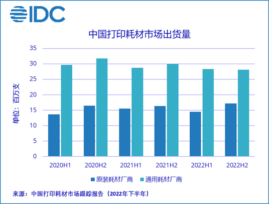 北京, 2023年5月25日——IDC发布的《中国打印耗材市场跟踪报告(2022年下半年)》显示,2022年下半年,中国打印耗材出货量为47.6百万支,同比下降2.5%。其中,喷墨类耗材出货量14.6百万支,同比增长3.3%;激光类耗材出货量33百万支,同比下降4.8%。
