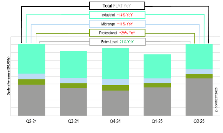 该公司最新的增材制造市场洞察报告显示,2025年第二季度入门级市场(低于2,500美元)的收入增长了21%,但专业级(2,500-20,000美元)、中端级(20,000-100,000美元)和工业级(100,000美元以上)机器的收入分别下降了29%、11%和14%。这些发现与 CONTEXT今年夏季发布的2025年第一季度报告的结果相似。