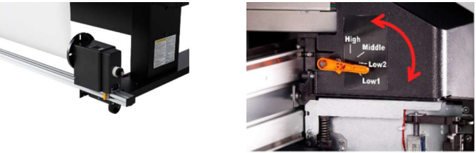 卷取装置与输出的开始/停止联动操作。此外,还具备一键式打印头高度调节功能,只需操作控制杆即可进行四种高度调节(1.5 毫米、2.0 毫米、2.5 毫米、4.0 毫米)。通过根据所用介质选择最佳打印头高度,可提高与介质的兼容性,并降低接触风险。