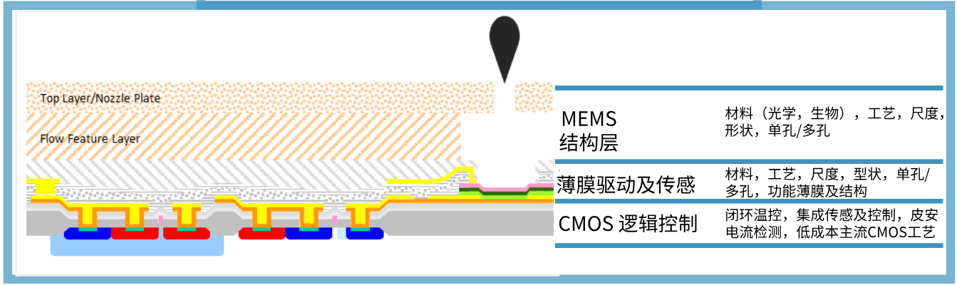 在喷墨打印头领域,典型结构包括热发泡驱动、微流道结构、薄膜驱动膜、闭环温度控制、液滴喷射控制等。