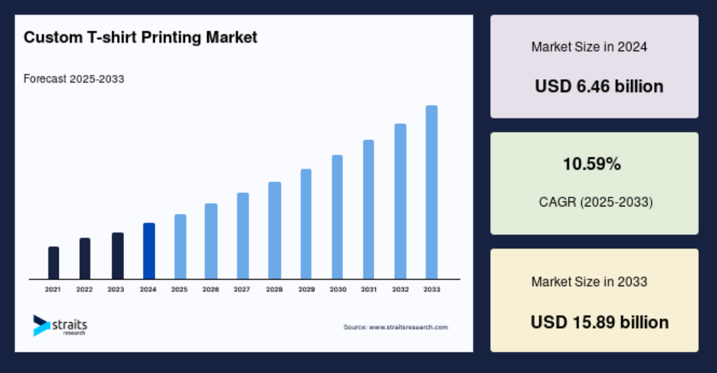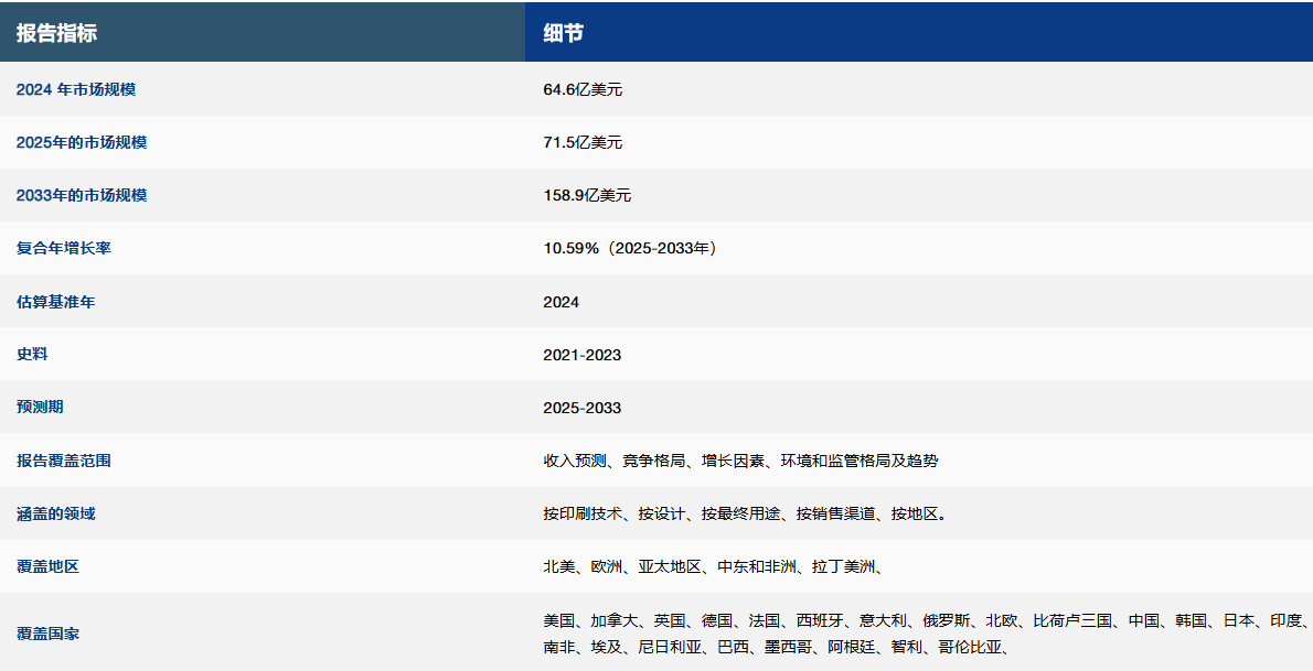 2024 年全球定制 T 恤印花市场规模为 64.6 亿美元 ,预计将从 2025 年的 71.5 亿美元增长 到 2033 年的 158.9 亿美元, 预测期内 (2025-2033 年) 的复合 年增长率 为 10.59% 。