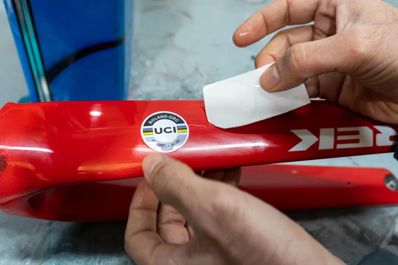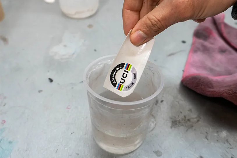 然后你把贴花从纸上转移下来,贴在自行车架上。水性贴纸非常薄,是装饰弧形表面的理想材料