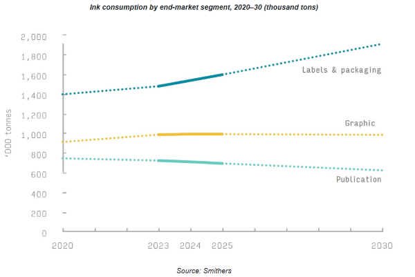 史密瑟斯发布的一份新的市场报告——《2030 年全球油墨市场展望》——指出,到 2025 年,用于商业图形、出版、包装和标签印刷的油墨需求量将达到 330 万吨,价值 358 亿美元,到 2030 年将增至 402 亿美元。