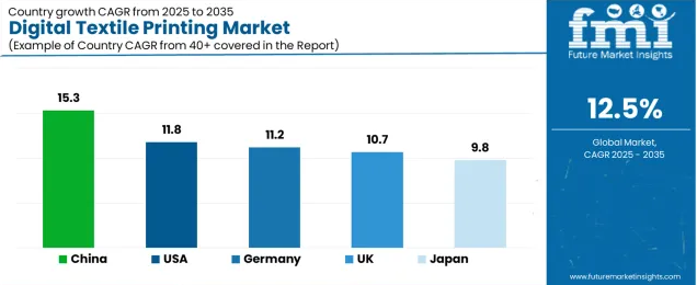 全球数码纺织印花市场正经历强劲增长,其中中国市场预计将以15.3%的复合年增长率领跑,直至2035年。这一增长主要得益于不断扩大的纺织制造业基础、蓬勃发展的时尚产业以及先进印花技术的日益普及。美国紧随其后,复合年增长率为11.8%,其增长动力来自不断上升的定制化趋势、日益完善的电子商务基础设施以及对按需生产解决方案的日益接受。