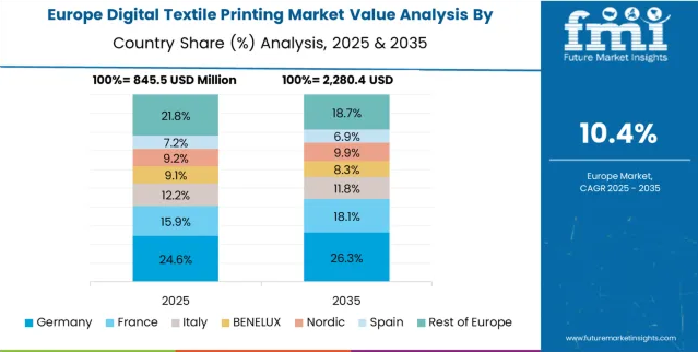 北欧国家的经济占比预计将从2025年的7.0%上升至2035年的6.5%,这主要得益于技术纺织品的广泛应用和先进的印刷技术。比荷卢经济联盟的经济占比预计将从2025年的5.5%上升至2035年的5.0%,这反映出其市场已趋于成熟,并以技术为导向。