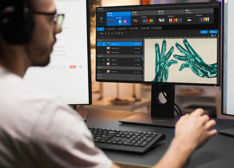 机器与规格上,DA-640 属于宽幅卷对卷(roll-to-roll)平台,最大打印幅面可达约 1,615 mm(63.5 英寸),最高打印分辨率可至 1,200 dpi,支持的介质厚度和卷材规格有一定约束(例如介质最大厚度与带襯底的厚度限制),并配套 500 ml 的 DIMENSE 墨盒与专属加热/烘箱系统以保证起形效果与固化稳定性。设备配有友好的触控操作界面,并可与 Roland DG 的 VersaWorks 7 RIP 及 Roland DG Connect Designer 中的 DIMENSE 模块配合使用,用以简化图案的浮凸/纹理制作流程。