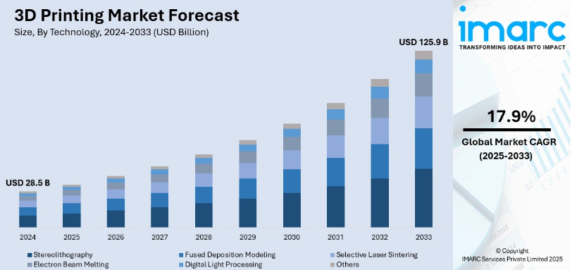 全球3D打印行业正迈入高速扩张的新阶段。根据 IMARC 集团最新发布的《2025-2033年全球3D打印市场研究报告》,2024年全球3D打印市场规模达到 285 亿美元。展望未来,该机构预计到 2033 年市场规模将达到 1259 亿美元,在 2025 至 2033 年期间实现 17.9% 的复合年增长率(CAGR),意味着行业规模将在未来几年内增长约四倍,这一增长幅度在制造业相关领域中极为罕见。