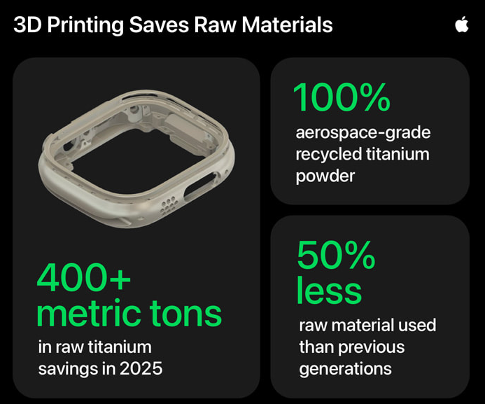 苹果在 Apple Watch Series 11 与 Ultra 3 上采用的粘结喷射 3D 打印技术,正在重构高端智能手表的制造逻辑。其核心流程展现出对传统工艺的颠覆性突破:首先将 100% 再生钛金属粉末进行雾化处理,降低氧含量至 900ppm 以下,随后通过六激光振镜系统引导激光束,以每层 60 微米的精度逐层熔融粉末,经过 900 次堆叠形成表壳雏形。打印完成后,通过真空清粉、超声振动除杂实现粉末 100% 回收,再经热压烧结、金刚石线锯切割及 CNC 精修最终成型。