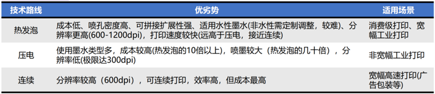 微流控芯片从技术路线来说,包括热发泡、压电、连续几种技术路线,其中热发泡式由于成本低、喷孔密度高、可拼接扩展能力强(能做宽幅打印)、适用水性墨水、生物相容性好、分辨率高、打印速度较快等优势,被广泛用于消费级喷墨打印机、宽幅工业打印、生物打印等场景,且由于墨水配方和MEMS薄膜材料的迭代,未来也将在非宽幅工业打印、商业打印等场景逐渐替代压电式。