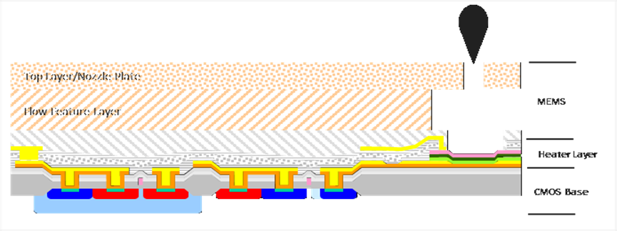 典型的热发泡式微流控芯片包括:1)驱动控制层:0.13-0.35 μm的CMOS工艺,主要用途是闭环控温、集成传感及控制、皮安电流检测等;2)薄膜驱动及传感层:采用贵金属+硅材料用MEMS工艺制成,精准匹配类液体材料(墨水、生物细胞、面板像素、染料等)的电气、热力学、物理特征,实现对于液滴的精准加热和控制发射;3)微流道层:采用光敏基材经过MEMS工艺制成微型流道,供加热发泡后带有动能的微小液体精准喷射到打印目标物上。