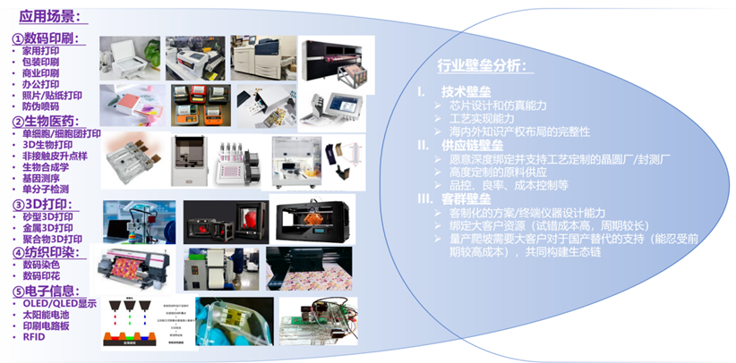 行业应用:微流控芯片主要用于数码印刷、生物医药、3D打印、纺织印染、电子信息等领域,其中数码印刷领域由于外资龙头如HP、Canon等多为IDM厂商(芯片→模组→设备),且在IP和专有技术方面拥有完整布局封锁,绕开难度极大;国内喷墨打印机的整机及上游芯片、模组国产化率低,尤其是芯片端之前多采用美国进口或中国台湾地区的低端仿制芯片,是典型的“卡脖子”产品;近年来由于国家对于打印安全的高度重视、以及消费级打印市场国产品牌的崛起和家庭消费打印的渗透率提升,对上游的喷墨打印芯片实现国产化的热度高涨。而生物医药领域近年来也高度重视数字液滴技术的应用,微流控芯片被逐渐用于细胞筛选、生物打印、药物输送、医疗检测、基因测序等应用领域。