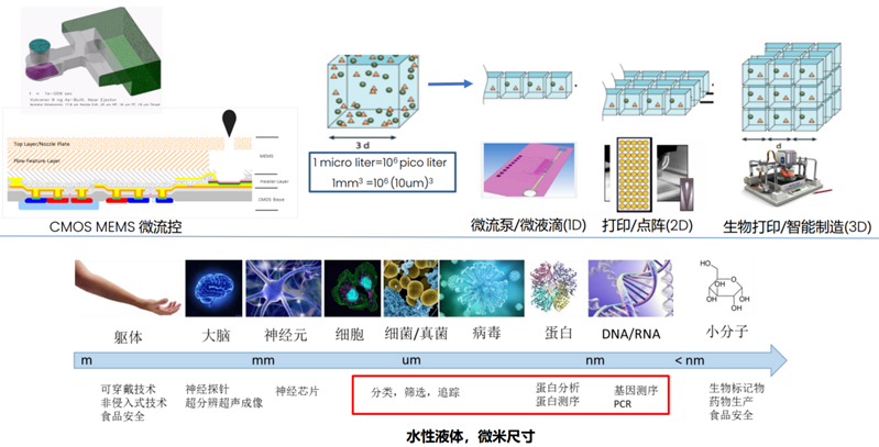 微流控(Microfluid)芯片是一种基于CMOS晶圆和MEMS晶圆的多层混合异构晶圆技术的芯片,其由细微的流道管路、腔室、开关阀门、流体驱动和控制元件组成,能够在微米级、皮升尺度上对液体进行驱动、控制、处理及分析,具有对液体进行自动化并行处理和精准操控的能力。