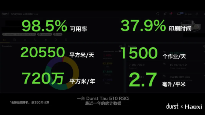 更关键的是,皓僖科技总经理严建海先生在随后的圆桌论坛上公布的实际生产数据,进一步印证了Durst的超高性价比与实际价值:一台Durst Tau RSCi在盛大印刷一年内的有效生产时间占比为98.5%,相当于全年内仅需约五天半的时间用于设备保养和检修维护,充分验证了Durst的超强稳定性;目前设备实际印刷时间占比仅为37.9%,仍然有很大的价值空间可以被进一步挖掘;但就在这不到40%的实际印刷时间内,单机日均生产20550平方米、单机年总产720万平方米,日均处理超1500个订单。可见,Durst设备的强大生产能力完全能够支撑盛大庞大的业务量需求;而单台设备的平均油墨用量为2.7毫升/平方米,体现了更优的成本边际效应。