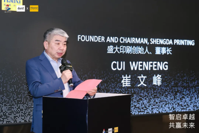 盛大印刷创始人董事长崔文峰先生对到场嘉宾表示了热烈欢迎。他强调,盛大印刷选择与Durst强强联手,核心不是为了单纯地添置硬件或者炫耀技术,而是为了寻求志同道合的伙伴,搭建深度协作同盟,共同探索数智化转型之路。这条道路上没有现成的标准答案,更没有孤立存在的赢家,盛大印刷作为真实鲜活的探索样本,将始终秉持开放包容的态度,与行业同仁携手共进,走得更稳、行得更远。