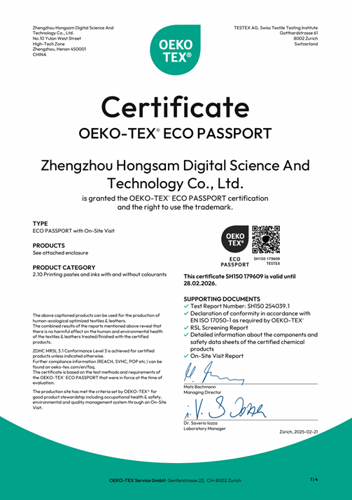 水性配方,不含重金属和甲醛,通过Oeko-Tex Eco Passport纺织品安全认证,助力数码印花工厂通过严苛的服装面料安全认证。