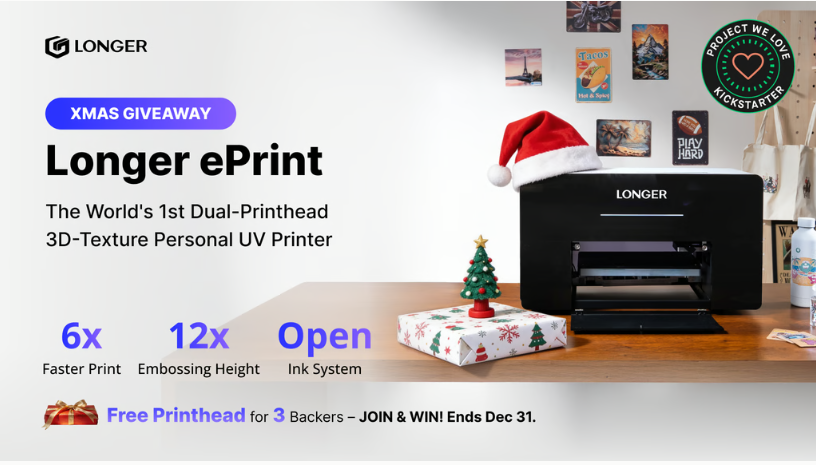当工业级打印能力被压缩进桌面级设备,一场关于创作与生产的效率革命已然来临。2025年11月25日,LONGER品牌推出的全球首款UV+DTF双工艺桌面级一体机ePrint在Kickstarter平台正式上线,瞬间引爆众筹市场——60秒内达成5万美元筹款目标,45分钟突破100万美元大关,截至目前已斩获421万美元众筹金额,登顶平台筹款金额榜首,成为现象级创业项目。这款产品的横空出世,不仅让LONGER成为首个实现UV与DTF技术桌面原生集成的品牌,更彻底打破了传统桌面打印的材料与场景限制,为个人创作者、小型工作室乃至商业生产带来了颠覆性可能。