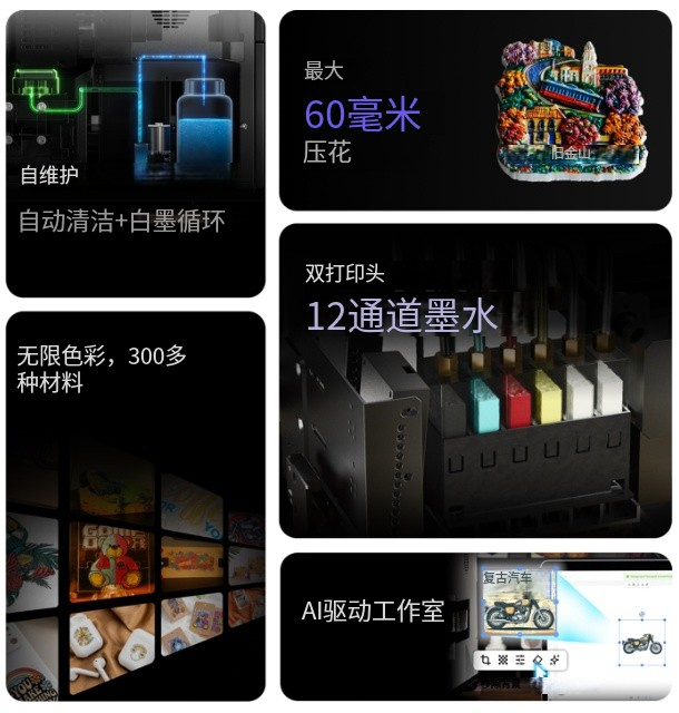 1440 DPI的高分辨率成像引擎,能在木材、金属、玻璃、陶瓷、纺织品等300多种材料上精准还原精细细节与真实色彩。更搭载AI辅助工作流程,支持图像生成、背景去除、文本转徽标、草图增强、双激光定位等自动化功能,大幅简化从设计到打印的全流程。无论是新手创作者的快速出图,还是专业工作室的批量生产,都能实现效率与创意的双重提升。