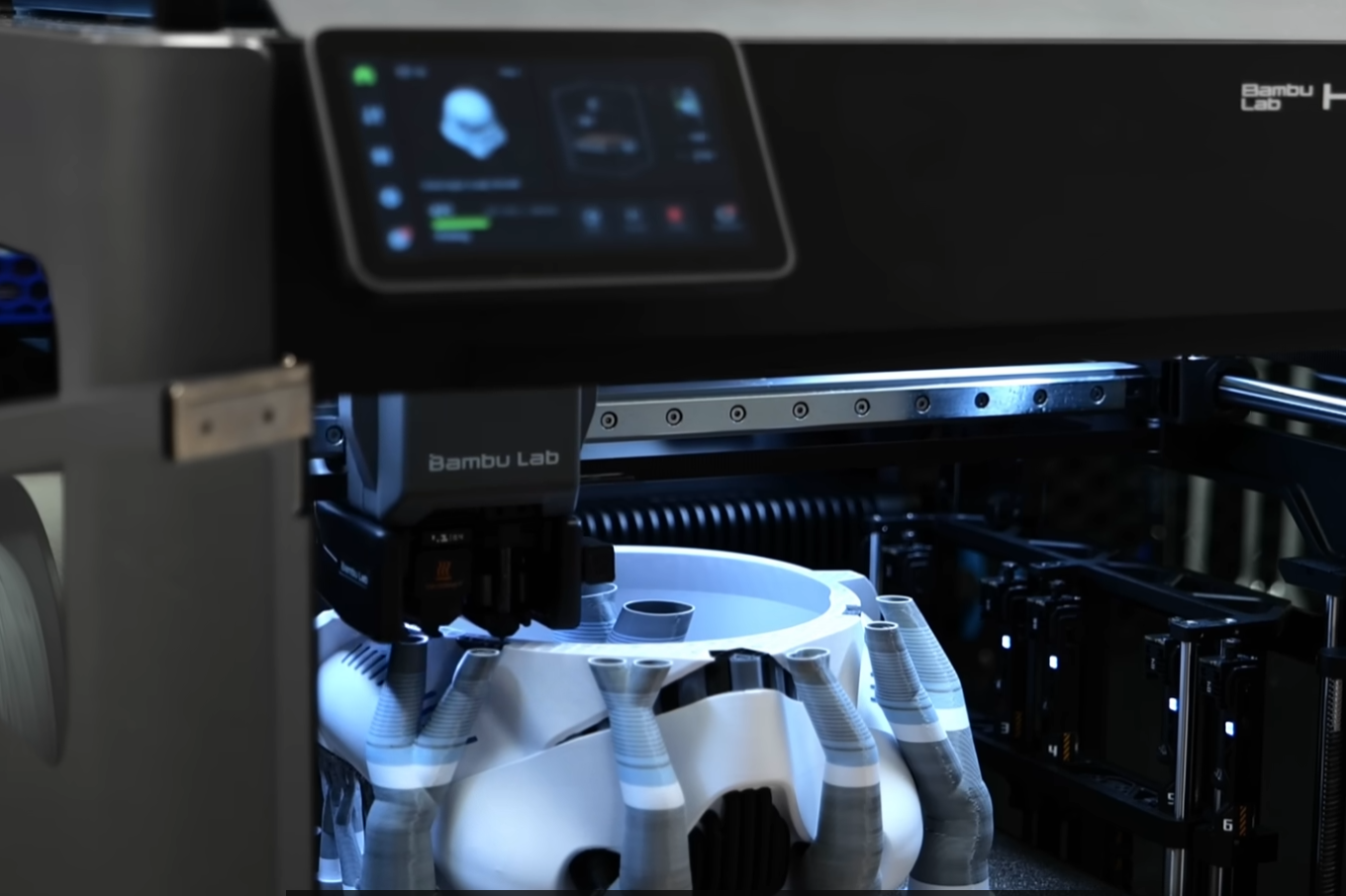 H2C的核心竞争力源于其搭载的Vortek热端更换系统,这一系统彻底改变了传统多材料打印的"洗喷头"模式,转而采用"换喷头"的创新思路——正如Bambu Lab在技术研发中提出的类比:"与其清洗画笔,不如直接更换画笔"。该系统将七个喷嘴集成于腔室右侧的专用机架中,依靠磁性附件与感应加热元件实现高速切换,机架通过垂直移动机构可快速完成刀具更换,让多材料打印的连续性大幅提升。