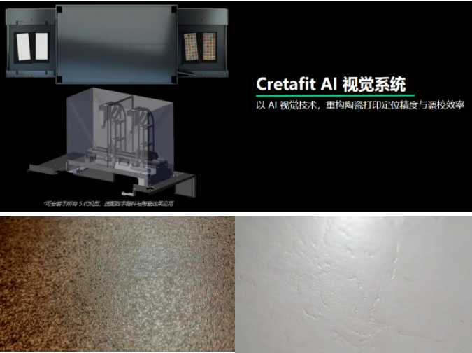 · AI智能对位加持:融入CretaFit AI视觉系统,进料处精准识别瓷砖位置与浮雕纹理,实时完成图形平移、旋转调整,毫米级定位打印无需停机,避免叠印与墨水浪费,大幅提升生产效率。