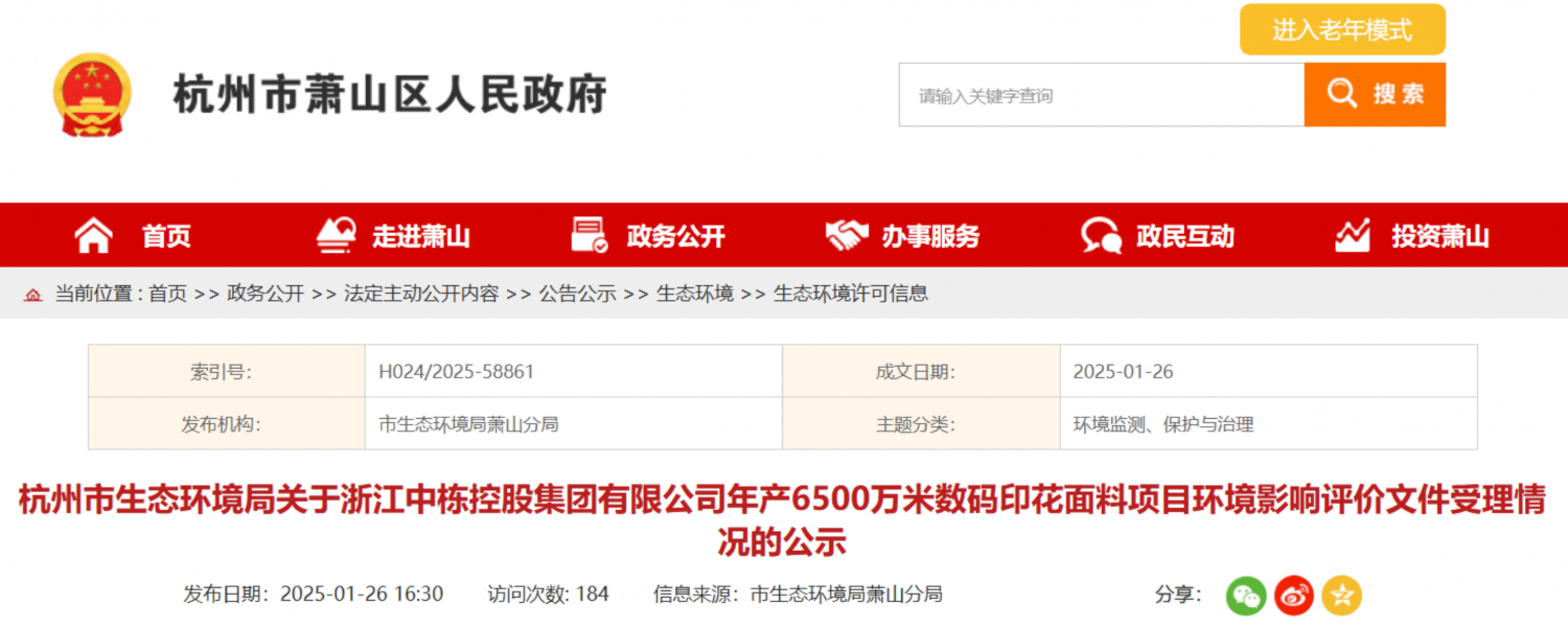 近日,浙江中栋控股集团有限公司年产6500万米数码印花面料扩建项目正式推进,该项目总投资3.8亿元,选址于浙江省杭州市萧山区衙前镇衙前路269号,依托萧山区存量工业用地有机更新政策支持,聚焦数码印花面料产能升级,助力区域纺织产业数字化、绿色化转型,进一步夯实衙前镇纺织印染产业集群优势。