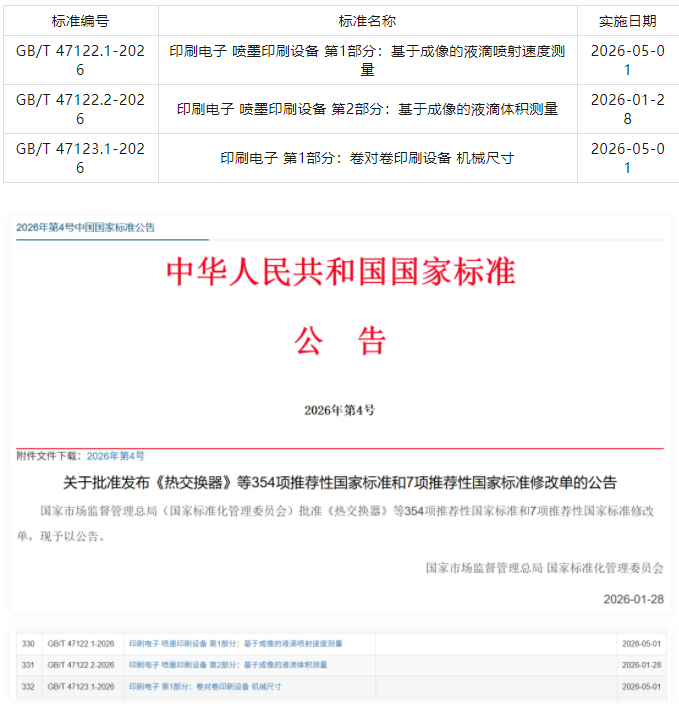 2026年将持续推进数字印刷设备领域的标准制定工作。目前已立项、正在征集起草单位的国家标准共4项:其中,《印刷机械 术语 第8部分:数字印刷机》标准将解决行业术语长期不统一的问题;产品类标准则覆盖广告喷绘领域的宽幅面喷绘机(第1、2部分),以及战略新兴产业的OLED显示器件喷墨打印机。