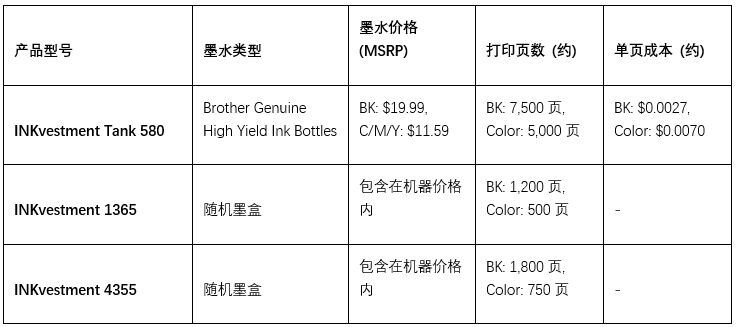 表1:Brother INKvestment Tank 系列部分型号墨水成本与印量分析