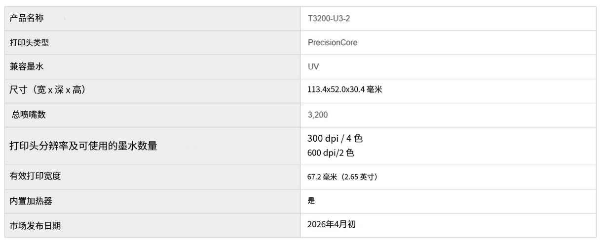 从产品规格来看,T3200-U3-2定位PrecisionCore系列商用及工业级打印头,兼容UV墨水,机身尺寸为113.4×52.0×30.4毫米,紧凑的结构便于设备集成;配备3200个喷嘴,支持300dpi/4色、600dpi/2色两种分辨率模式,有效打印宽度达67.2毫米(2.65英寸),内置加热器可精准实现50℃墨水加热,兼顾打印精度与生产效率,能够适配不同场景的打印需求。