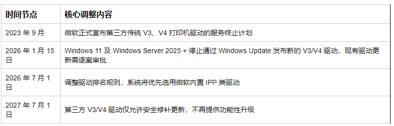 2026 年 1 月,微软正式启动 Windows 11 打印生态的重大升级,通过非安全更新逐步停用 V3、V4 传统打印机驱动,覆盖 24H2、25H2 核心版本。这一举措并非突发调整,而是微软 2023 年 9 月就已官宣的长期规划,核心目标是根除传统驱动的安全隐患,推动打印系统向现代化、标准化的 IPP(互联网打印协议)架构转型。