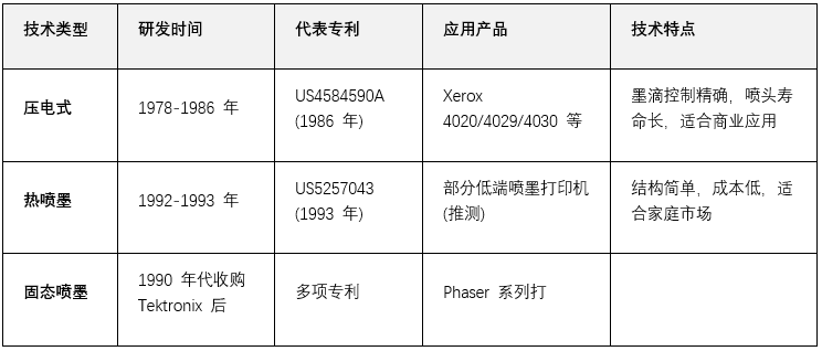 2000 年施乐收购 Tektronix 获得固体墨技术,进一步丰富了其喷墨技术组合,但早期独立发展的压电和热喷墨技术仍是其喷墨业务的重要技术基础。