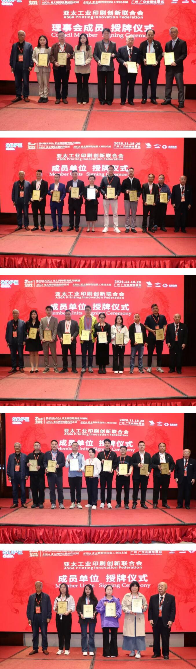 发布会现场还举行了隆重的签约与授牌仪式。各方主办单位 完成合作签约,正式确立共同主办第48届ASGA亚太网印数智化印刷展,为展会的高品质举办筑牢合作根基;同时向亚太成员国协会代表及企业授牌,进一步夯实亚太地区网印数码印花行业的协作基础,为展会的国际化布局奠定坚实保障。
