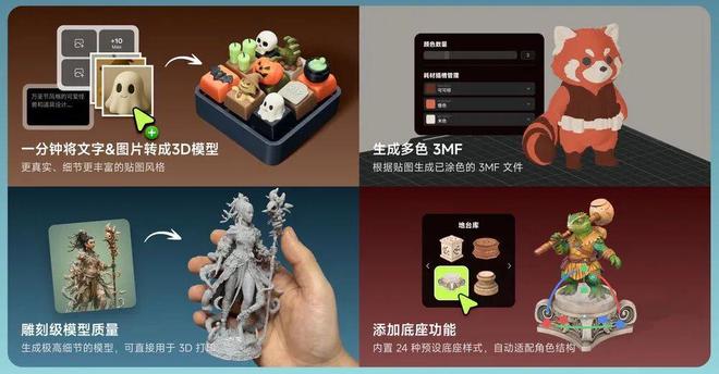 针对多色打印场景,双方实现了技术协同升级:Meshy的多色打印功能完成优化,可将复杂纹理自动转化为边缘清晰、精准匹配拓竹AMS耗材的色彩方案,彻底改变了传统打印中“手动涂色”的繁琐流程。用户无需在切片软件中反复调整色彩参数,只需将Meshy生成的3MF文件直接拖入Bambu Studio,就能实现从AI建模到实物打印的无缝衔接,真正实现“所见即所得”,大幅降低了3D打印的使用门槛,让创意落地更高效。