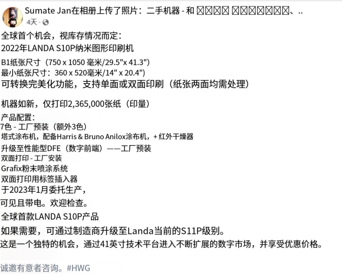 这台 220 万美元的二手兰达 S10P,不仅是一台设备的流转,更是Landa 转型阵痛与全球高端数码印刷市场的缩影。它究竟会被哪位买家收入囊中?又是否会开启 Landa 二手机流通的序幕?我们将持续关注。