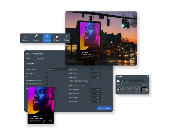 此外,ColorMatch 还支持直接在 RIP 软件中创建媒体配置文件,进一步丰富了介质适配的灵活性。VersaWorks 7.5 还同步升级了多项实用功能,新增对象级色彩控制能力,优化可变数据打印功能,并改进出血与重叠设置,这些升级不仅缩短了设备前期设置时间,降低了对专业技术人员的依赖,更能保障专业级的色彩精度与输出重复性,满足高标准的生产需求。