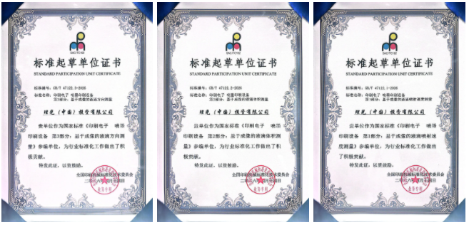 在这三项新标准的起草过程中,理光中国作为重要的参与单位,凭借理光集团对喷墨技术数十年的研究成果,在工业喷头领域深厚的技术积累,与丰富的应用实践经验,深度参与了这三项标准的起草工作,确保了标准的先进性、实用性与国际接轨性。